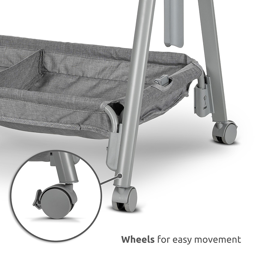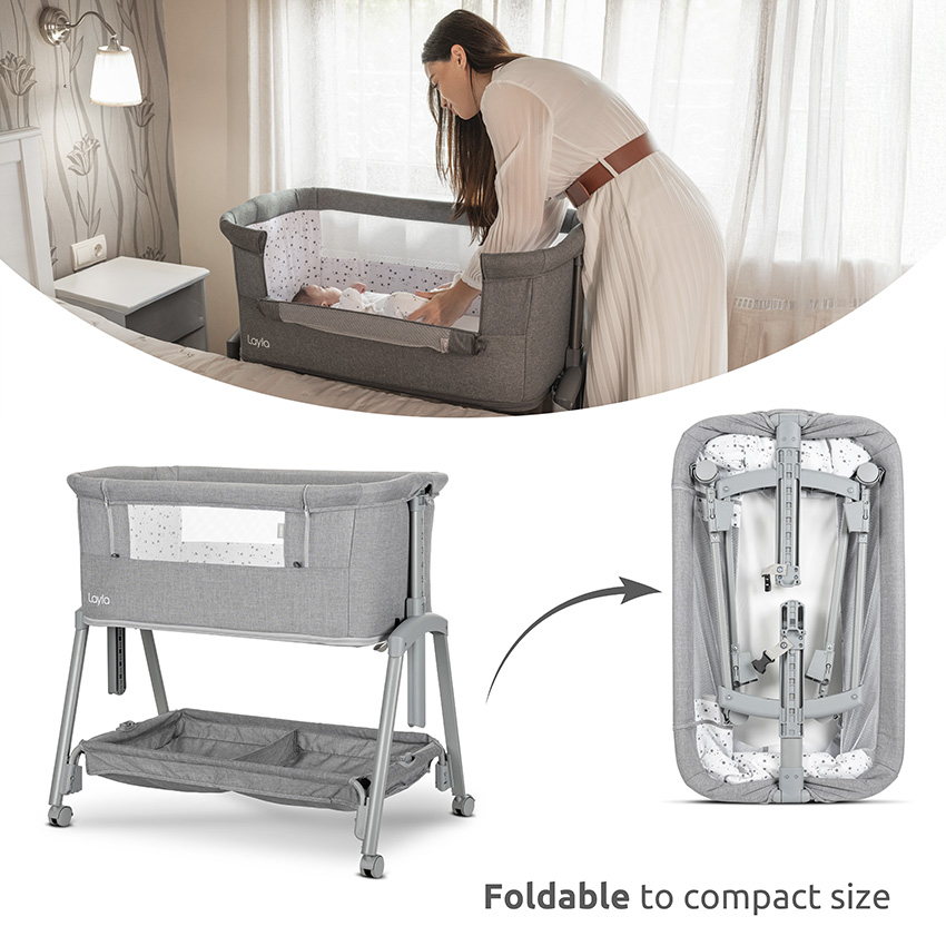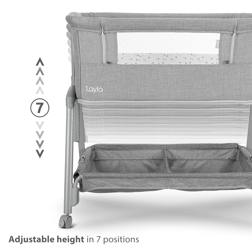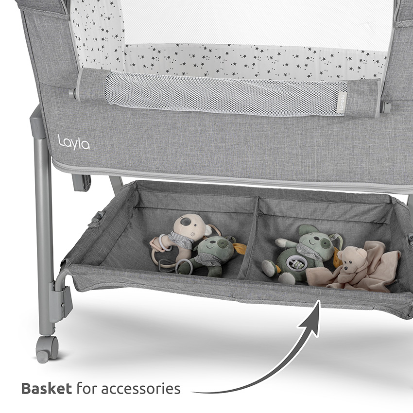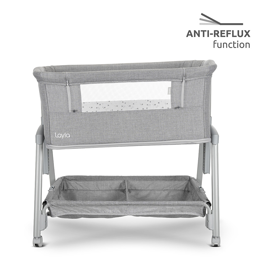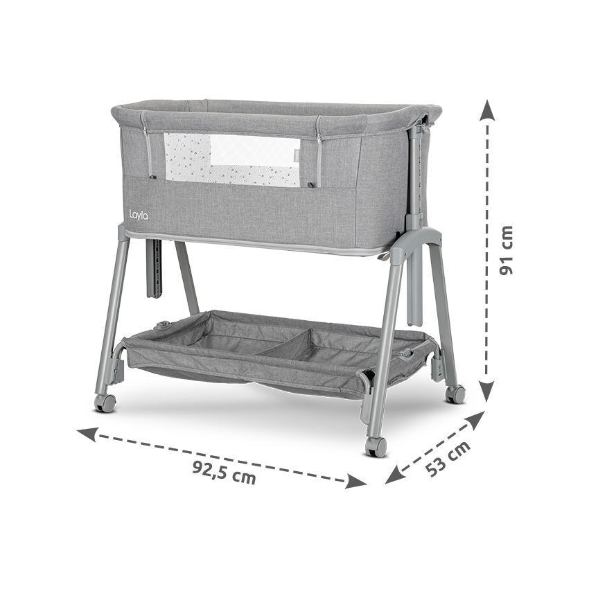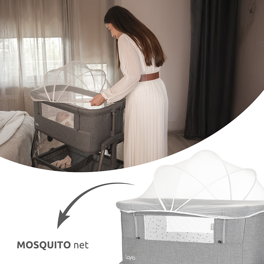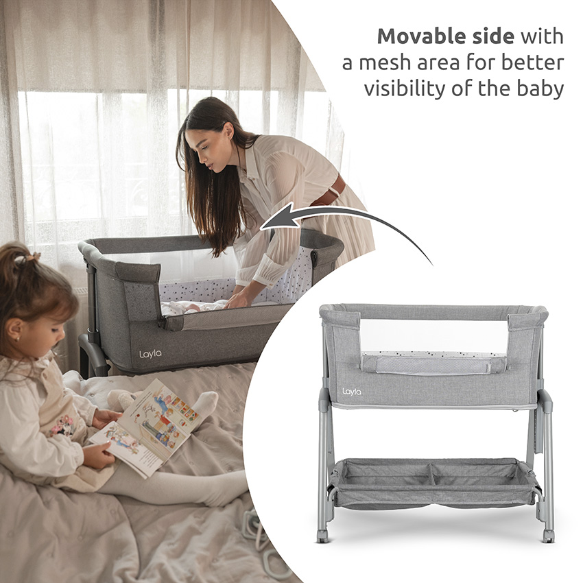 Διαθέτει ρυθμιζόμενο ύψος για εύκολη προσαρμογή στο κρεβάτι των γονιών, διευκολύνοντας τη νυχτερινή φροντίδα. Τα πλαϊνά με δίχτυ προσφέρουν σωστό αερισμό και συνεχή εποπτεία, ενώ η σταθερή κατασκευή εξασφαλίζει ασφάλεια κατά τη χρήση.