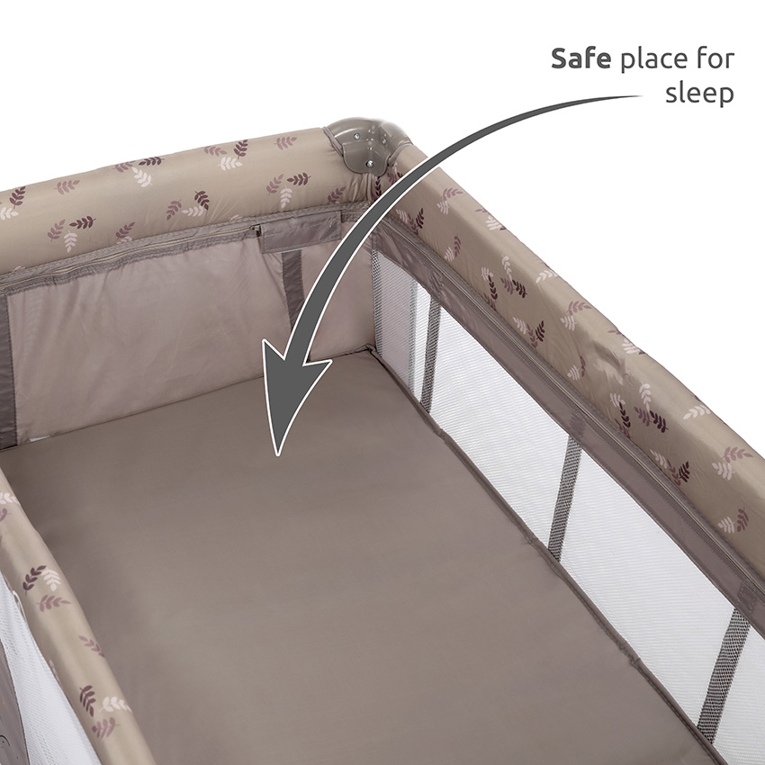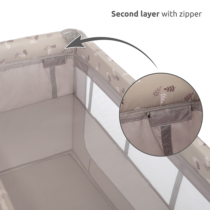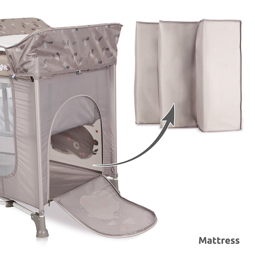 Περιλαμβάνει πρακτική αλλαξιέρα και μαλακό στρώμα για μεγαλύτερη άνεση. Τα πλαϊνά δίχτυα προσφέρουν συνεχή εποπτεία, ενώ το πλευρικό άνοιγμα με φερμουάρ διευκολύνει την πρόσβαση του παιδιού.