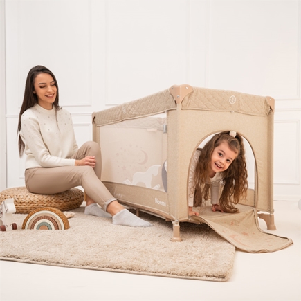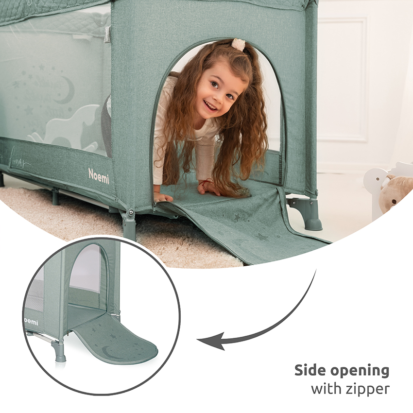 Τα πλαϊνά με δίχτυ επιτρέπουν τον συνεχή έλεγχο του παιδιού, ενώ το πλευρικό άνοιγμα με φερμουάρ διευκολύνει την πρόσβαση και το παιχνίδι.