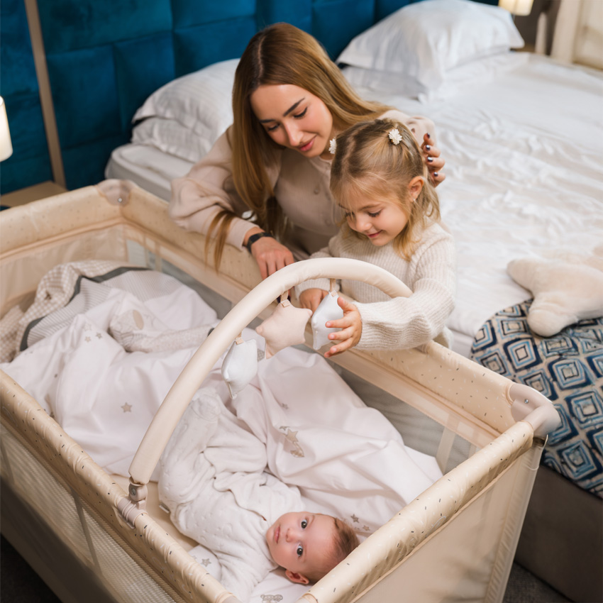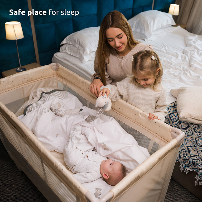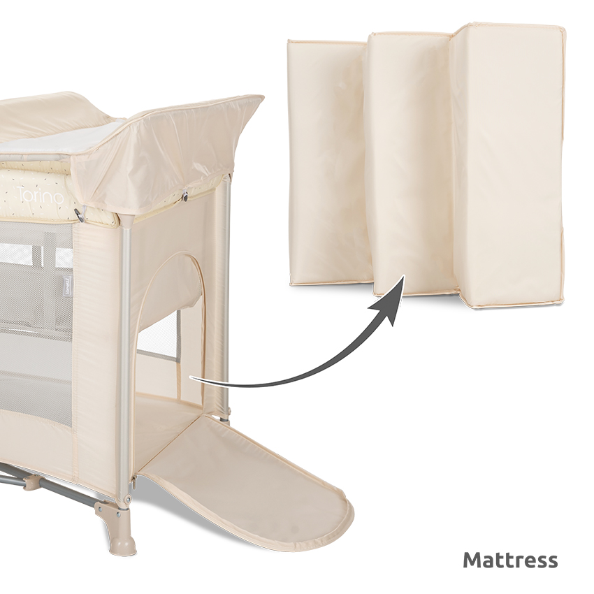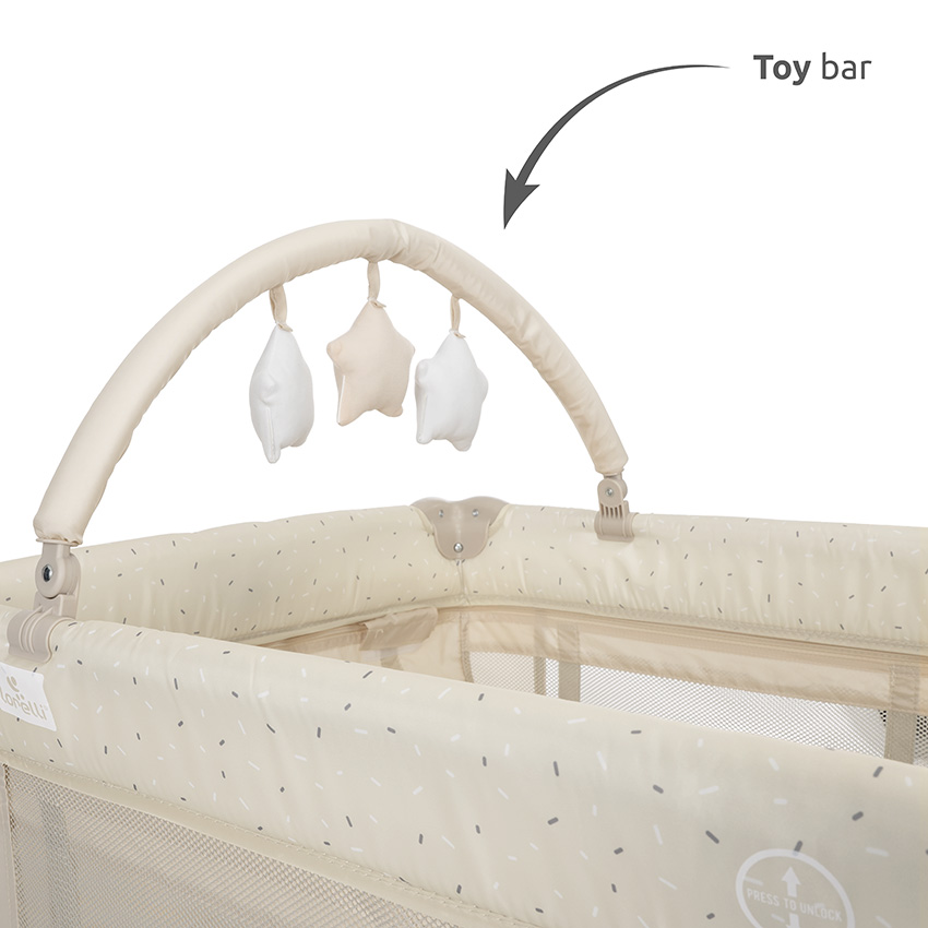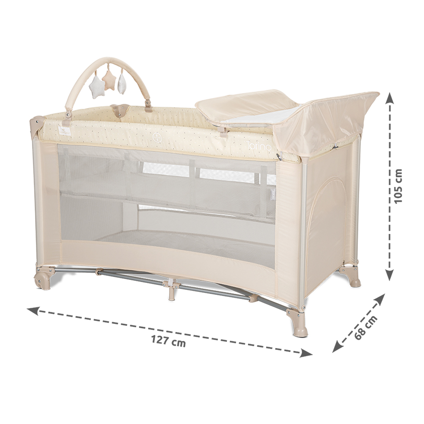 Διαθέτει δύο επίπεδα, με το επάνω επίπεδο να είναι ιδανικό για νεογέννητα, προσφέροντας εύκολη πρόσβαση χωρίς να επιβαρύνεται η μέση των γονιών. Περιλαμβάνει πρακτική αλλαξιέρα και μπάρα παιχνιδιών που ενισχύει την απασχόληση και ανάπτυξη του παιδιού.