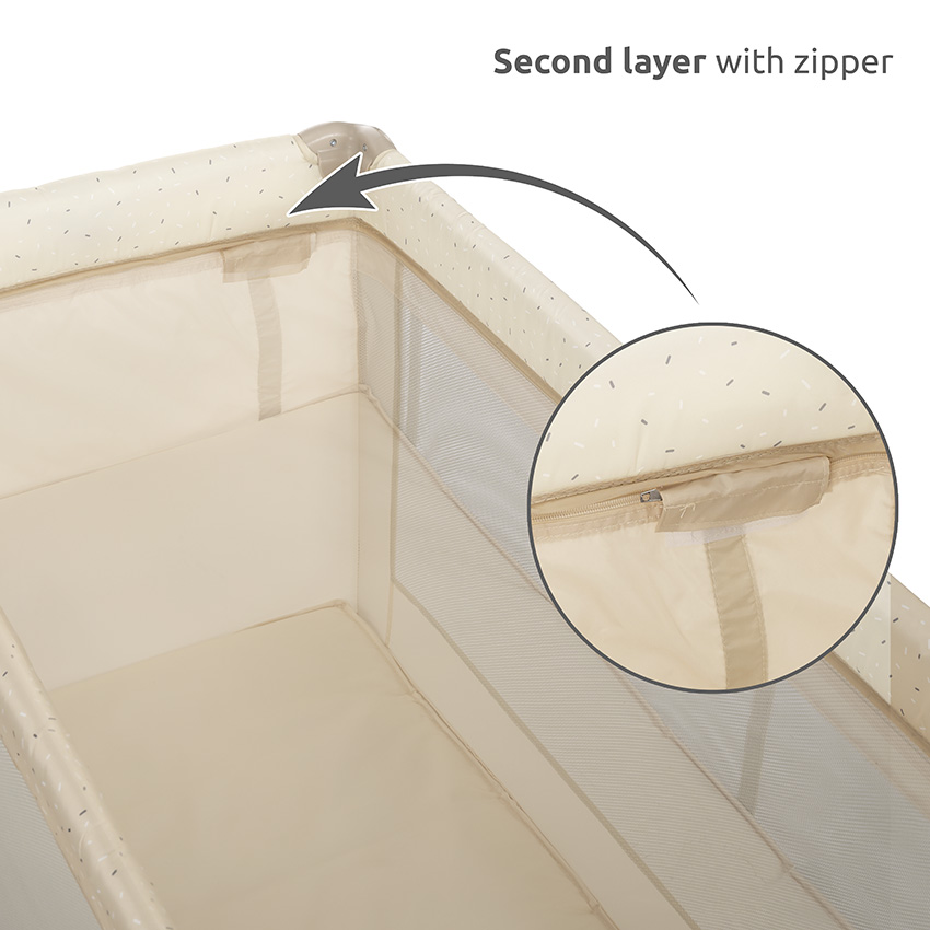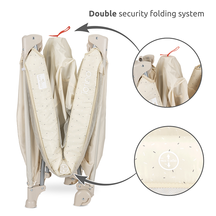 Η σταθερή κατασκευή με διπλό σύστημα ασφαλείας εξασφαλίζει μέγιστη προστασία, ενώ το πλευρικό άνοιγμα με φερμουάρ διευκολύνει την είσοδο και έξοδο του παιδιού. Χάρη στον πτυσσόμενο σχεδιασμό του, μεταφέρεται εύκολα και αποθηκεύεται σε μικρό χώρο, αποτελώντας ιδανική επιλογή για ταξίδια.