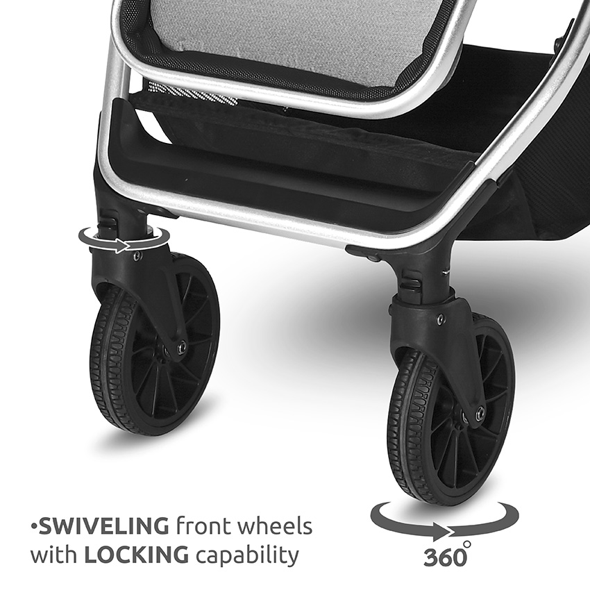 - Οι μπροστινοί τροχοί ανθεκτικοί στην φθορά, περιστρεφόμενοι 360º με δυνατότητα κλειδώματος.