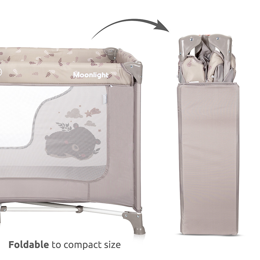 Πρακτικό παρκοκρέβατο Lorelli Moonlight 1 επιπέδου, ιδανικό για ύπνο και παιχνίδι, με εύκολη αναδίπλωση και μεταφορά για χρήση στο σπίτι και στα ταξίδια.