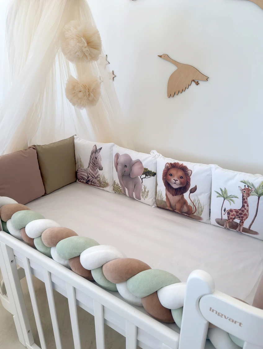 Παπλωματοθήκη, μαξιλαροθήκη και σεντόνι, ραμμένο από φυσικό βαμβακερό υλικό ποπλίνας. Το σεντόνι με λάστιχο ταιριάζει απόλυτα με το σχήμα του στρώματος. Το σετ μπορεί να χρησιμοποιηθεί για ορθογώνιες και οβάλ κούνιες.