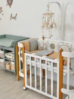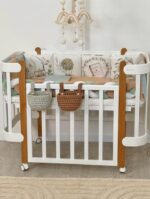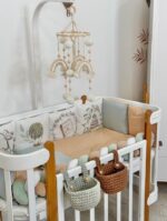Παπλωματοθήκη, μαξιλαροθήκη και σεντόνι, ραμμένο από φυσικό βαμβακερό υλικό ποπλίνας. Το σεντόνι με λάστιχο ταιριάζει απόλυτα με το σχήμα του στρώματος. Το σετ μπορεί να χρησιμοποιηθεί για ορθογώνιες και οβάλ κούνιες.
